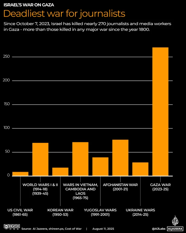 Al Džazíra uvádza, že v súčasnej vojne Izraela v Gaze zahynulo doteraz niekoľkonásobne viac novinárov, ako v ktorejkoľvek vojne doteraz (graf vľavo).